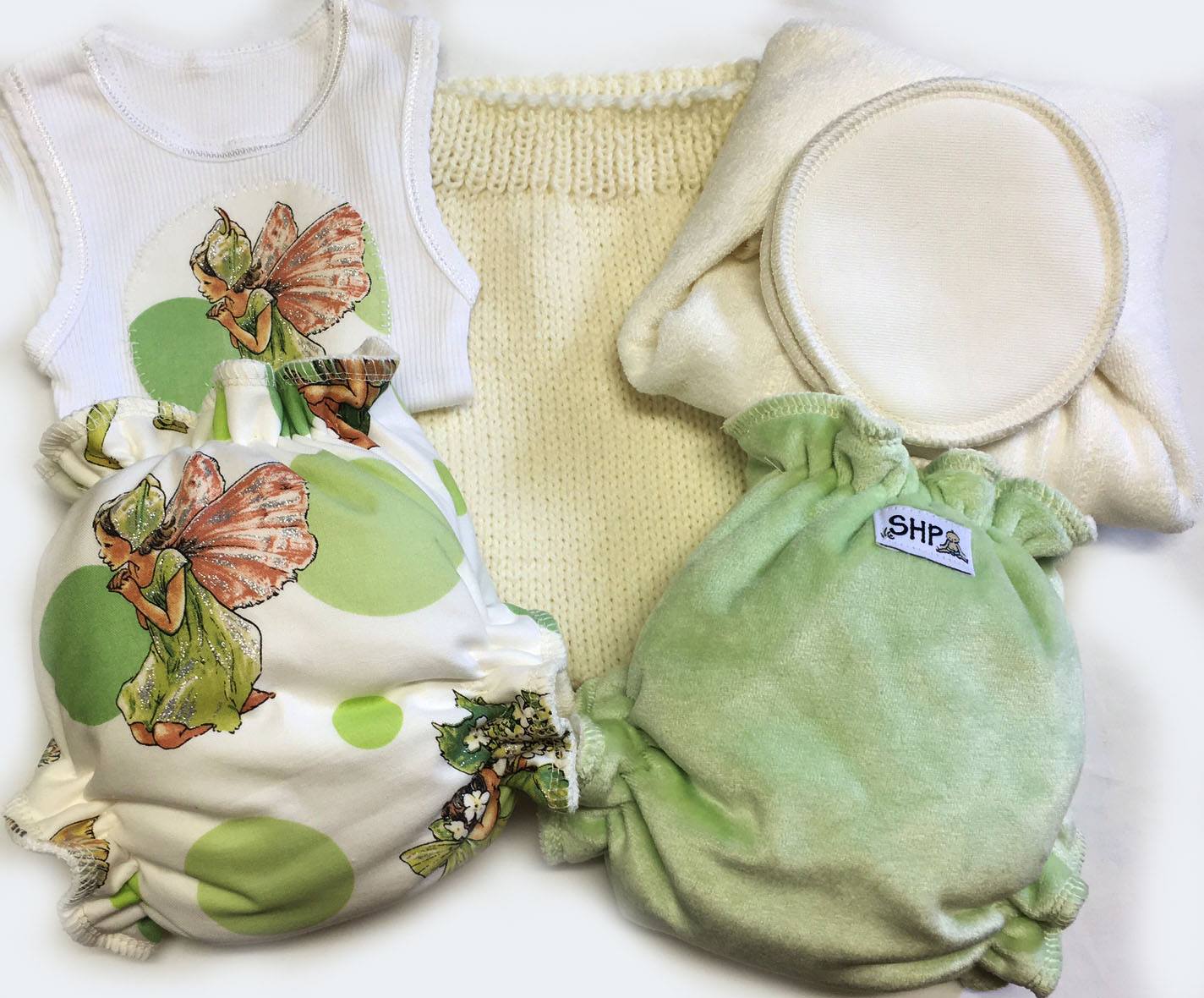 A Deluxe SHP Flower Fairy “Cloth from Birth” Trial Pack. All natural no synthetics. Included is a newborn-small patterned “Daysie” Nappy, our award winning soooooh soft 0-6 month bamboo velour “Lushie” Nappy, a prefold nappy, snappi (not pictured) and extra universal bamboo booster, a small Woollen soaker, an appliqued 0-3 month singlet and a pair of bamboo reuseable breastpads. Instructions for care will come with purchase. Just ignore the fabric selection bit Hayden will remove it soon I don’t know how ( New website glitch) You’ll need to put something like an x in the box to move forward in the purchase